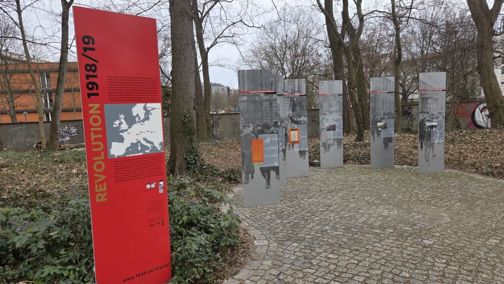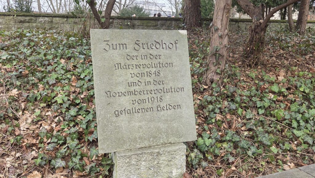 Ursprünglich ein Friedhof, heute eine Gedenkstätte am Rande des Volksparks Friedrichshain: Tatsächlich sind auf dem Friedhof der Märzgefallenen 255 Revolutionsopfer der Märzrevolution 1848 beigesetzt. Später diente der Friedhof aber auch als Bestattungsort für die Opfer der Novemberrevolution 1918. Von November bis Dezember 1918 wurden an diesem Platz 33 Berliner Helden und Opfer von 1918 bestattet. Damit wurde aus dem Friedhof zugleich ein Gedenkort für die Opfer des Kampfes um Freiheit und Demokratie – diese Ideale verbinden die beiden Revolutionen 1848 und 1918.